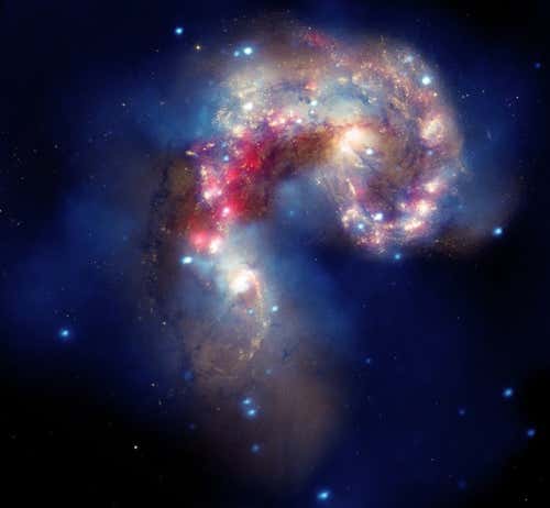 The colliding Antennae galaxies appear here at a relatively early stage of the collision process, which began about 500 million years ago. The collision has triggered the formation of millions of stars in clouds of dust and gas. The biggest of them have already exploded into supernovae.