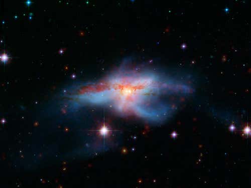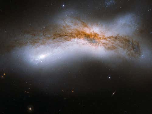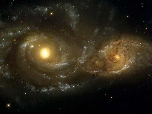 NGC 2207, the larger galaxy on the left, will eventually merge with IC 2163, its smaller neighbour. Tidal forces generated by NGC 2207 are already distorting the smaller of the pair.