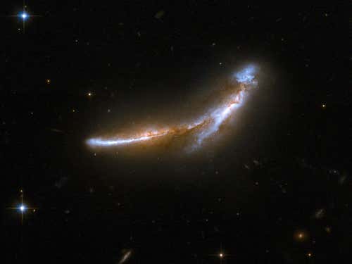 The two spiral galaxies have previously come close to colliding, 40 million years ago. IC 2163 does not have enough energy to escape the pull from its larger neighbour forever and, billions of years from now, only one galaxy will remain.