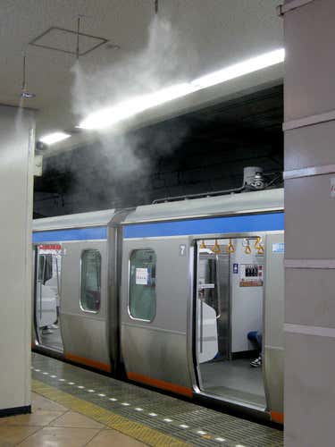 Some underground train networks, including those in Italy, Japan and Spain, have successfully introduced artificial misting systems to help keep platforms cool. The mist functions like sweat, absorbing and removing latent heat energy as it evaporates.