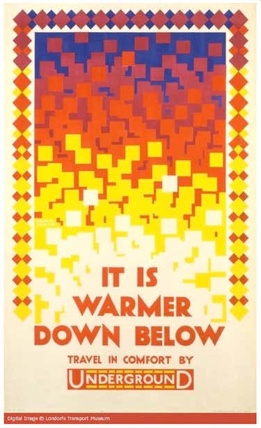 Far from putting commuters off, warm temperatures underground used to be seen as a winter treat, as this advertising poster from 1924 demonstrates. However, temperatures have increased significantly since then, with an all-time peak being reached five years ago: then, temperatures at one station reached a sweltering 47 °C.