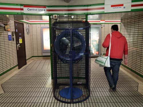 Large, industrial fans installed in purpose-built ventilation shafts are a more effective way of cooling the tube. Thirteen such shafts along the Victoria line have recently been updated with these more powerful fans, which can extract hot air at a rate of 75 cubic metres per second. However, this still has only a limited cooling effect for the passengers in the tunnels down below.