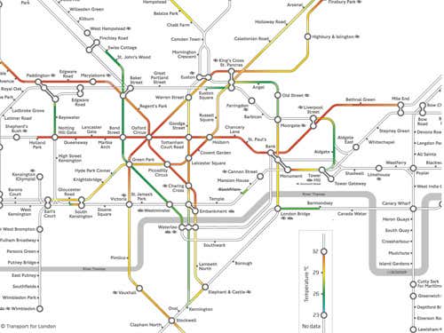 This map shows the maximum temperatures reached across the London system in 2008. The Central and Bakerloo lines were the hottest, with temperatures reaching 32 °C. In contrast to these two lines, both of which are over a century old, the Jubilee line, built in the late 1970s, reached only a cool 25 °C.