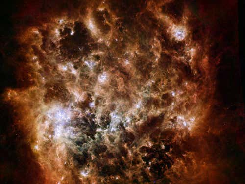 The Large Magellanic Cloud is home to SN 1987A, the largest supernova to have gone off in our vicinity in modern times. The force of a supernova explosion should blast any surrounding dust grains back into their constituent atoms – yet puzzling measurements indicate the presence of enough dust there to make 200,000 Earths.