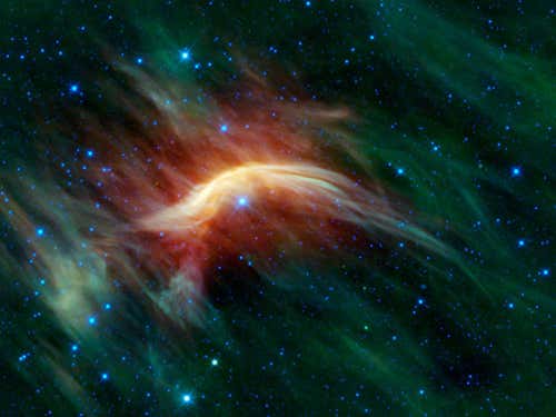 As the massive blue star Zeta Ophiuchi ploughs its way through our own galaxy some 360 light years away, infrared images reveal a “bow shock” of dust making way for it.