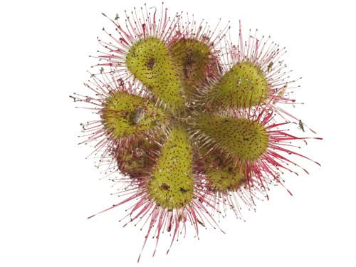 In the mountain fynbos, or “fine bush” areas of Table Mountain National Park in Cape Town, South Africa, nary a bird swooped through Liitschwager’s bright green frame, though many flew around it. Still, the photographer did come face to face with the jumping spider (Aelurillus cristatopalpus), many a rugged species of ant – including the nutcracker (Pheidole capensis) – and much lush and colourful plant life, including this Alice sundew (Drosera aliciae).