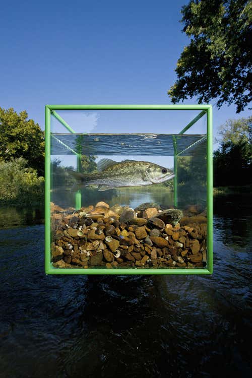 The idea was to place Liittschwager’s standard cube frame in this river in Lillard’s Mill, Tennessee – home to 54 different species of mussel and 32 species of fish – and photograph everything within. But algae made the water too murky to get clear shots. Last-minute improvisation, after Liittschwager made a trip to the local hardware store, converted the frame into a mini-aquarium: he and collaborators then simply scooped up a sample from the river.