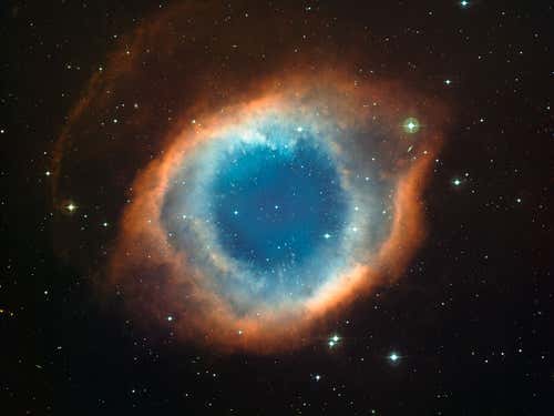 This image of the Helix nebula (NGC 7293) is a colour composite of data from the Wide Field Imager, a 67-megapixel camera attached to the 2.2-metre Max Planck Society/ESO telescope at La Silla Observatory in Chile. Oxygen atoms shine blue-green at the centre because of intense ultraviolet radiation from the 120,000 °C central star. Further out, hydrogen and nitrogen glow red. Remote galaxies can be seen through the centre of the nebula.
