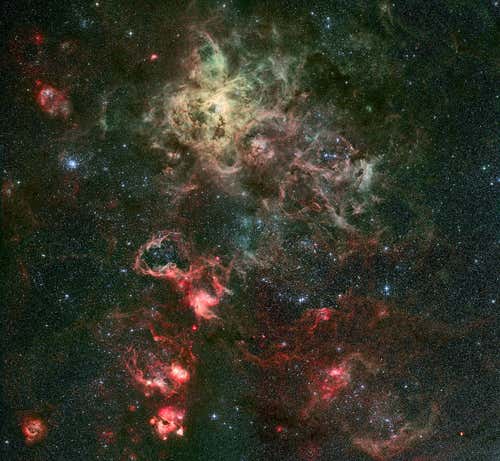 The Tarantula nebula (top centre) is surrounded by a web of filaments containing the well-studied supernova SN 1987A, 168,000 light years from Earth. It was discovered by Ian Shelton and Oscar Duhalde at Las Campanas Observatory in Chile on 24 February 1987, and independently by Albert Jones in New Zealand within 24 hours. Several other nebulae are coloured red, and the cluster of young stars on the left is called NGC 2100.