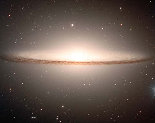 M 104, an early-type spiral galaxy in the constellation Virgo, is known as the “Sombrero” because its shape resembles the Mexican hat. It is about 50 million light years from Earth. The bulge at the middle of the galaxy is mainly composed of mature stars, and the nearly edge-on disc contains stars, gas and dust. This picture, taken by the FORS1 multi-mode instrument on the Antu telescope of the Very Large Telescope array, is a composite of three exposures in different wavebands.