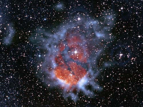 This colour composite image of the nebula RCW120 shows an expanding bubble of ionised gas 10 light years across. It causes surrounding material to collapse into dense clumps from which stars are born. The original images taken with the LABOCA camera on the 12-metre Atacama Pathfinder Experiment (APEX) telescope.