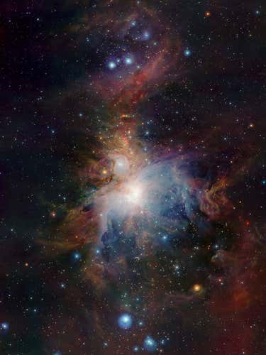 The Orion nebula (M 42) is about 1350 light years from Earth. This infrared image, taken by VISTA, shows young stars deep in the nebula, which are obscured by dust when observed with visible light. This image, a composite of 10-minute exposures taken at different wavelengths in the near-infrared part of the spectrum, covers a region of sky about 1 by 1.5 degrees.