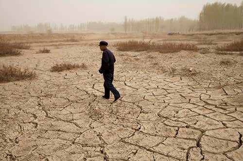 A sheep herder stands near fragile springtime grass in the aftermath of a dust storm in Wuwei, China. Chinese farmers have transformed 400,000 square kilometres of cropland and verdant prairie into new deserts. The area of desert created is equivalent to more than half the farmland in Canada.