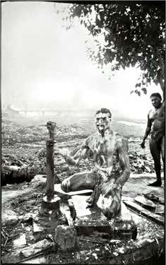 Rizwan Sadir, a wrestler and factory worker, showers from a hand pump next to the Ravi river in Pakistan. Hand pumps are not deep enough to avoid the polluted water.