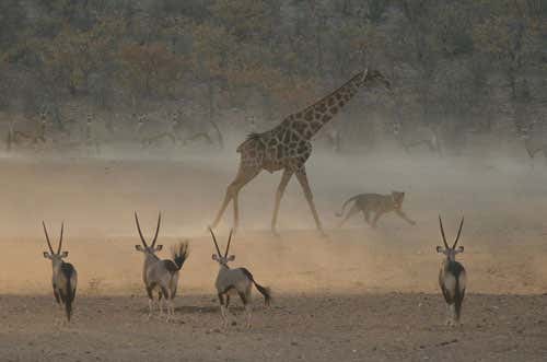 No lion in its right mind would dare to attack a grown giraffe: a well-placed kick from one of those long legs could be fatal. Yet as Catriona and assembled gemsbok watched one evening near a waterhole at Hobatere Lodge in Damaraland, Namibia, this young male lion repeatedly harassed the thirsty giraffe.