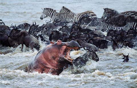 A hippopotamus attacks a wildebeest crossing the Mara River during the Great Migration.