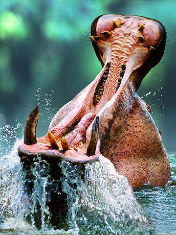 Mouth wide open, a hippo threatens any potential rival. Hippos show their huge teeth in order to intimidate possible enemies; a noisy and aggressive display is often sufficient to deter less dominant males.