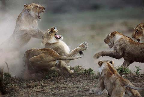 A group of lionesses aggresively fight off an intruder. They had been attacking a buffalo when the arrival of the stranger distracted them.