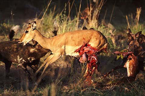 Death is quick, as wild dogs work in highly organised groups and are very efficient hunters, killing and devouring their prey in a remarkably short space of time.