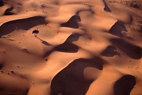 A male ostrich crosses the seemingly barren dunes of the Namib Desert. Rain is exceedingly rare in the desert, but moisture from fog which rolls in from the cold Atlantic supports a surprising range of plants and animals.