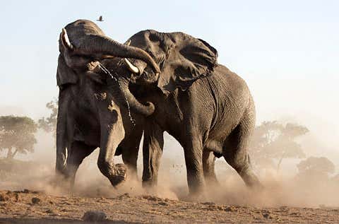 Dust swirls around a pair of bull elephants as they fight. Serious clashes between bull elephants, though rare, involve head ramming and wrestling with tusks.