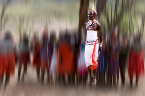 Samburu men compete in a dance ritual to see how high they can jump, keeping their arms by their sides. The warriors know that the highest jumper earns the respect of the women watching, and possibly their affections.