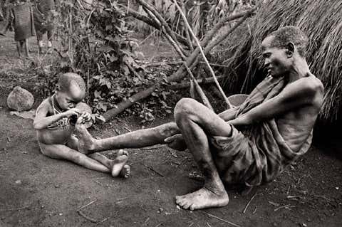 A young boy, concentrating intensely, picks a thorn from a Suri elder’s toe.