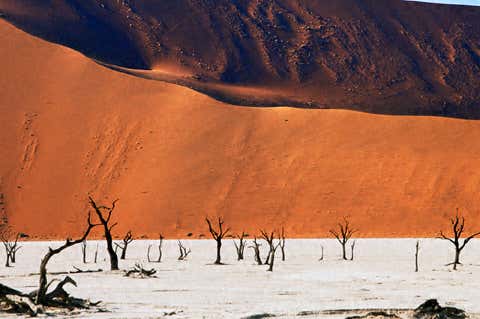Ancient fossilized trees stand in Dead Vlei against a backdrop of red dunes.