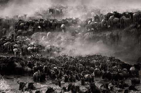 In massed formation, dust rising in clouds as they thunder down the river bank, vast numbers of wildebeest plough into the Mara River during the annual migration.