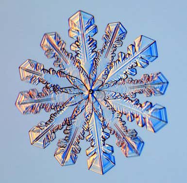 This snowflake has fernlike stellar dendrites – the branches of the stellar crystals have so many sidebranches that they look like ferns.