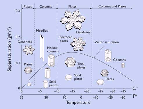 By growing snow crystals in the lab under controlled conditions, scientists have discovered that their shapes are determined largely by temperature and humidity. This picture summarises the crystal shapes formed under different conditions.