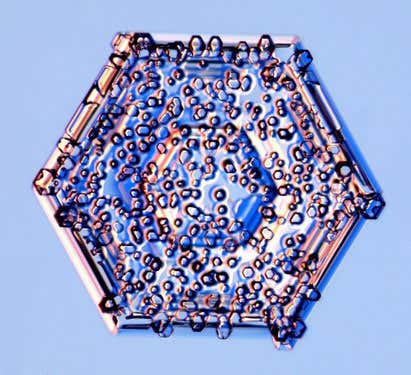 These are the largest snow crystals, often falling to earth with diameters of 5mm or more. Despite their large size, these are single crystals of ice – the water molecules are lined up from one end to the other.