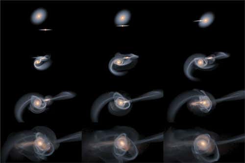 The tidal interaction forms a spiral structure, throwing off long tidal tails.