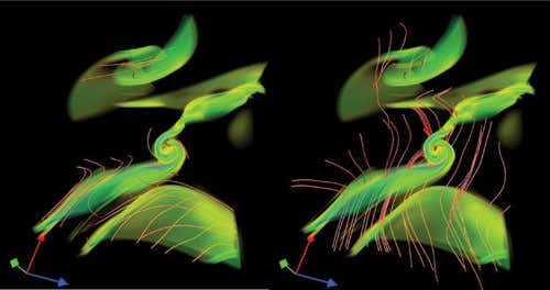 The left-hand image shows current intensity and magnetic field lines in a simulation of the flow of an electrically conducting fluid. Integrated velocity field lines are shown on the right.