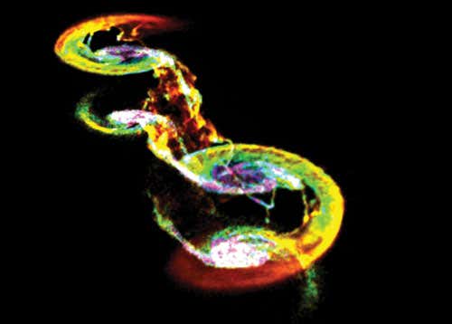 This sequence is taken from an animation modelling a galactic collision over 10 billion years. Density, gravitational potential and mass scalar fields are represented by colour, size and geometry.
