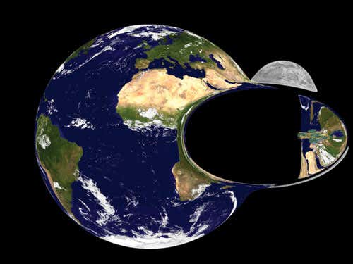This image shows a simulation of the distortion due to a spaceship inside a warp bubble moving past the Earth and Moon, as seen from space.