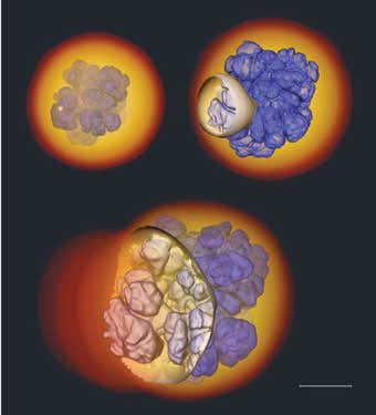 A type 1a supernova, from the onset of detonation through to the ignition of the flame (the blue surface). The white surface is the detonation front.
