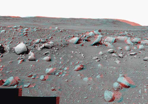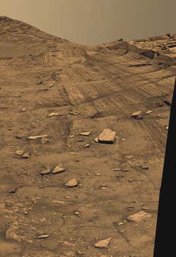 This Pancam sol 287 stereo view approaching Burns Cliff makes the terrain seem relatively flat, until you realize that the rover and the cameras are themselves tilted at more than a 20° angle.