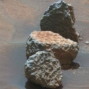 This Pancam image from sol 506 shows numerous details of the shape and texture of three large, isolated rocks encountered on the flanks of Husband Hill, near the summit.
