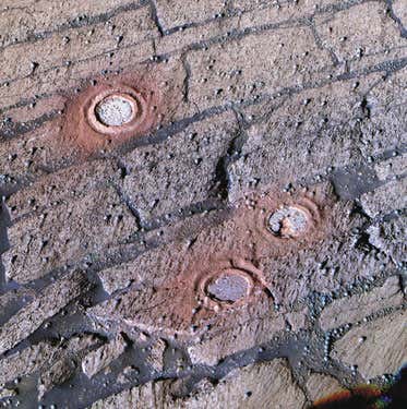 This Pancam false color image from sol 150 shows three holes that were ground into areas only 5 to 20 cm away from each other, using the Rock Abrasion Tool (RAT).