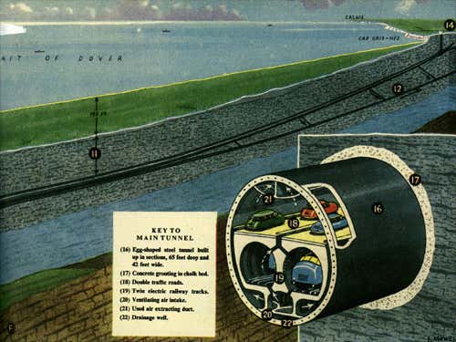 This is an undated cutaway of the “latest ideas put forward” for the “channel tunnel” to bridge the Dover Strait between Britain and France.