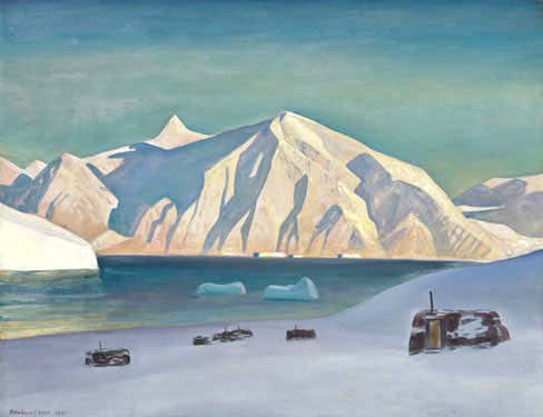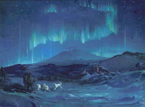 In his painting Aurora Australis, he uses the southern lights – the southern counterpart of the northern lights – to frame an iconic view of polar exploration at the turn of the 20th century, showing the rough shelters and sled dogs.