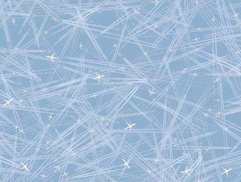 This image depicts 11,000 jet trails, equal to the number of commercial flights in the US every eight hours. Around 85,000 commercial flights take off around the world each day, and this number is predicted to double by 2050.