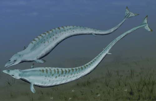 Around 35 to 40 million years ago, Protocetids evolved into Basilosaurids (represented here) and Dorudontids. Both groups of animals were fully aquatic and had small rear flippers, remainders of their ancestors’ hind legs. (Image: Arthur Weasley)