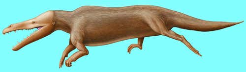 After Pakicetids came Ambulocetids. They lived in swampy regions, could both walk on land and swim in water but may not have been very fast in either environment. They are sometimes thought of as having been crocodile-like in their habits (Image: Carl Buell)