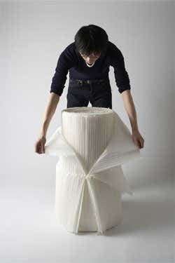 Japanese design company Nendo has found a new use for the pleated paper that is an unwanted by-product of fabric manufacture. The roll of paper is gradually peeled away to form a chair. The nail- and screw-free chair will appeal to the environmentally conscious, says Nendo.