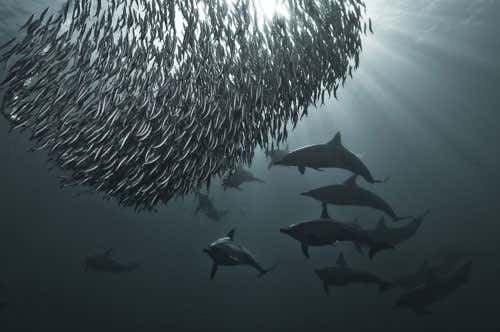 Common dolphins charging a massive shoal of sardines (a “bait ball”) off the coast of Port St. Johns in South Africa.