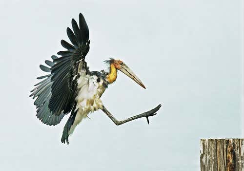 This is a Lesser Adjutant, a large wading bird, executing the perfect landing on a disused wooden pile. Because of the birds’ size, not all their landings are perfect – they have been known to crash and break their legs.