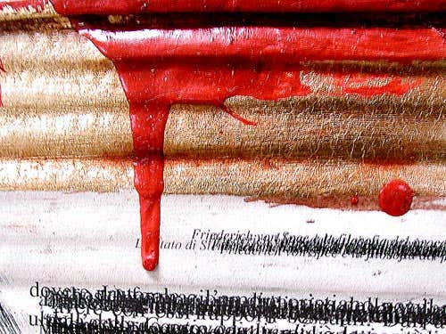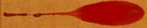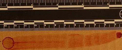 Wet drop of blood that has been smeared or wiped to the right before it is dry.
