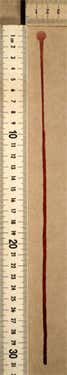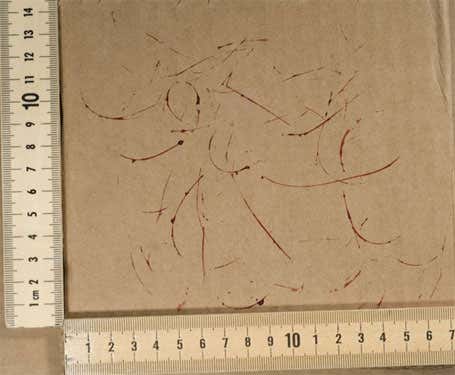 Blood-covered hair coming in contact with a surface. Similar patterns could be created by a cockroach or fly moving over drops of blood and then trailing it.